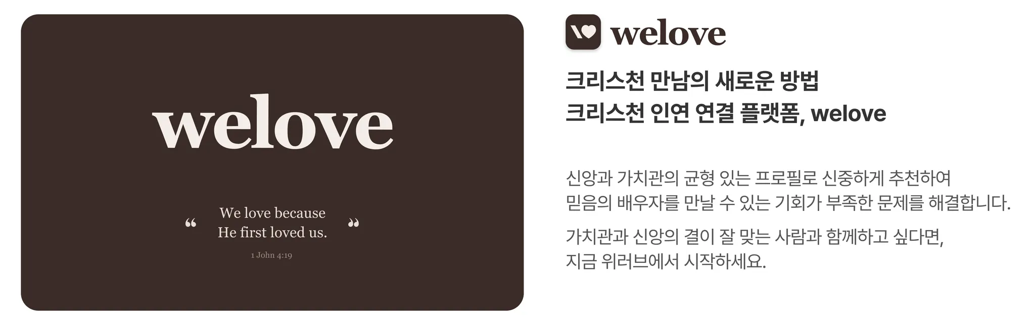 3만 크리스천 인연 연결 플랫폼, 위러브(welove) 등 다양한 소셜 서비스를 운영하고 있습니다.